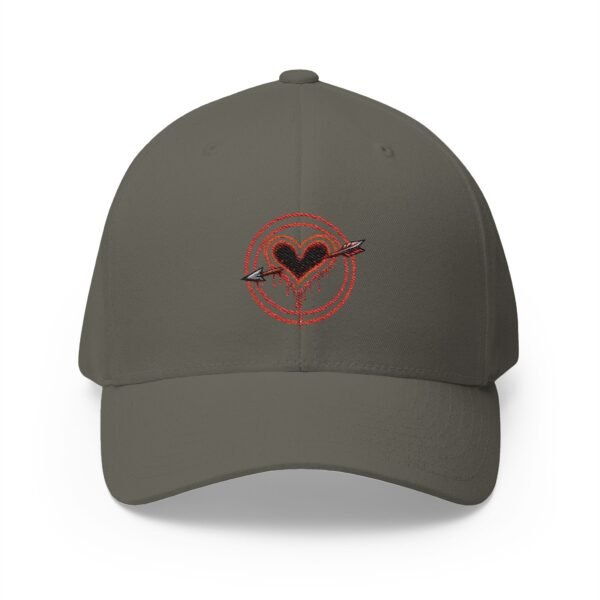 A clean, structured cap with a soft curve and subtle embroidered emblem that reads like a quiet personal statement. The mid-profile silhouette keeps it low and wearable, while the silver undervisor adds a hint of unexpected polish when you glance down. Built with a stretch band for a close, comfortable fit, this cap moves with you—on city walks, morning runs, or when you simply need a little sun-shield that still feels thoughtful. The embroidered heart-target motif sits centered on the front, small but expressive, adding handcrafted texture to a minimalist canvas.