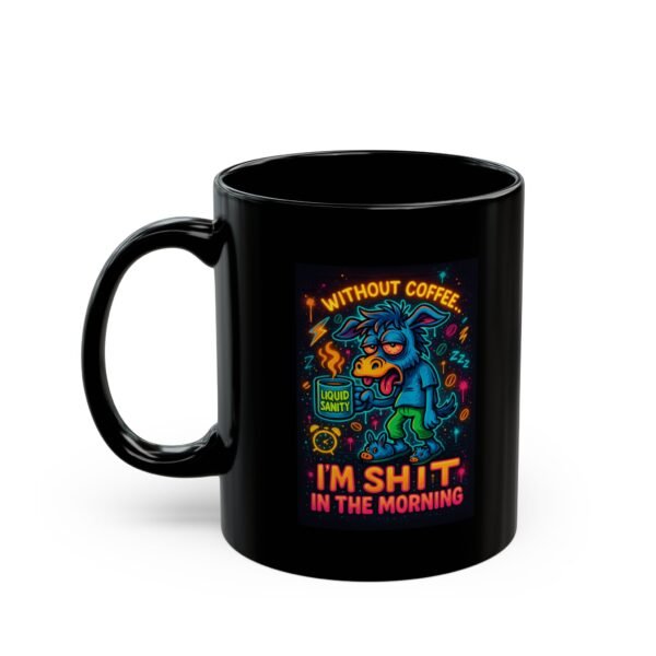 Fuel your mornings with attitude! This bold neon graffiti–style mug features Donnie the Donk stumbling out of bed in his donkey slippers, clutching a steaming “Liquid Sanity” coffee cup. Surrounded by neon doodles of beans, alarm clocks, and graffiti splatters, the design pops with dripping text: “Without Coffee… I’m Shit in the Morning.” A hilarious and edgy mug for caffeine addicts who can’t function without their first cup.