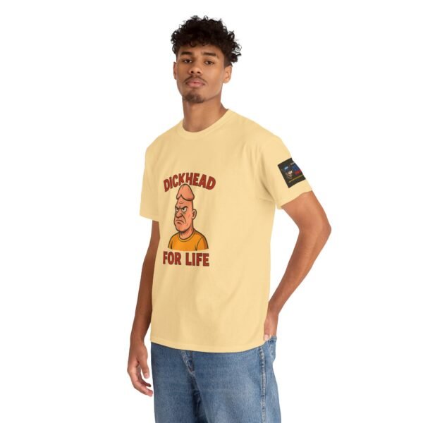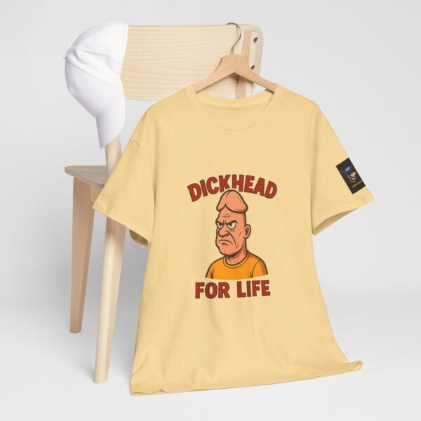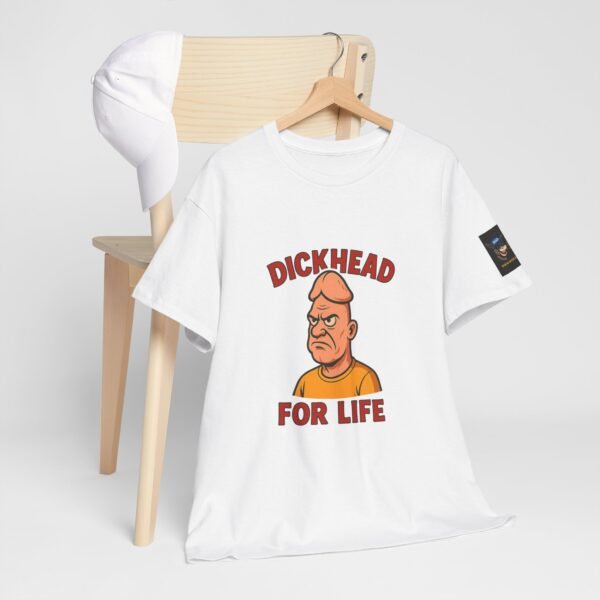 Turn heads and crack smiles with the Dickhead for Life graphic tee. This bold novelty t-shirt features a hilarious cartoon character with a head that lives up to the name, paired with big red lettering that reads “Dickhead for Life.”
