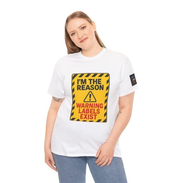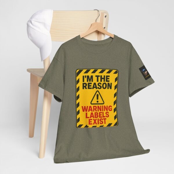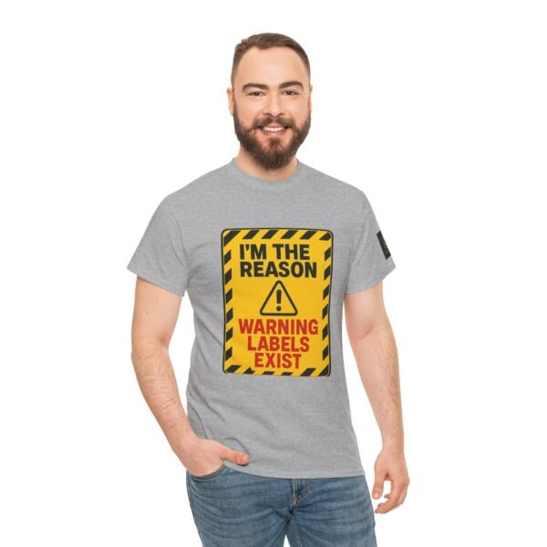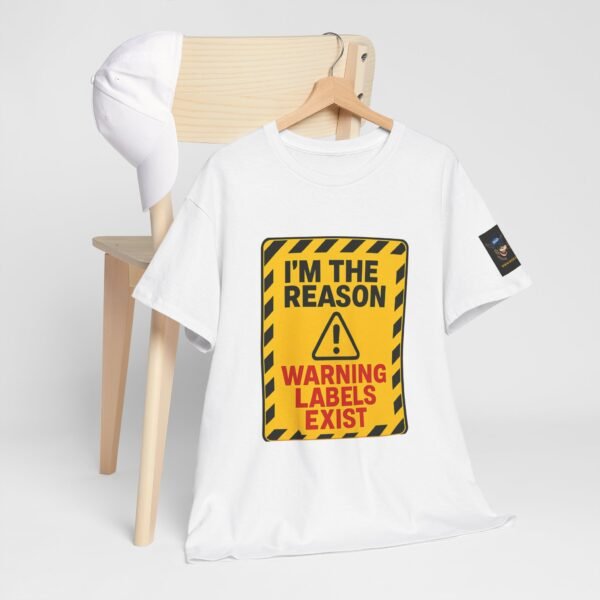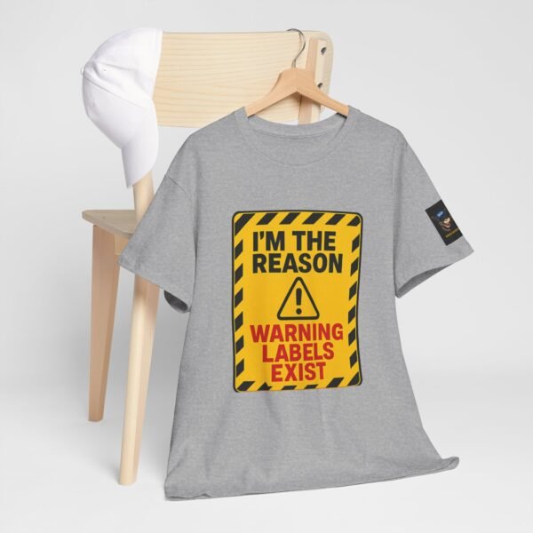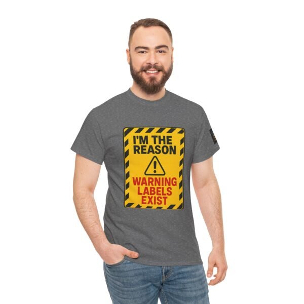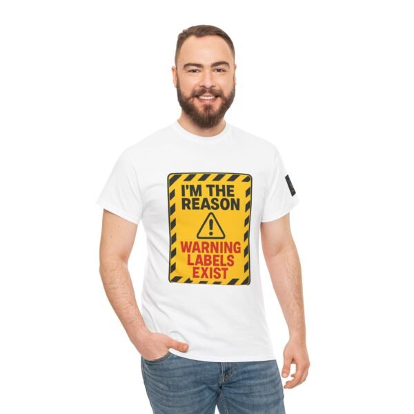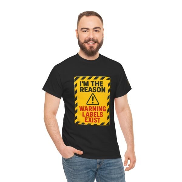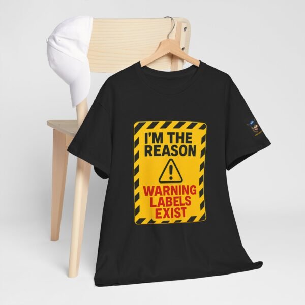 Turn heads with this bold “I’m The Reason Warning Labels Exist” T-shirt, available only at Wise Ass Prints. Designed like a hazard sign with black stripes, red lettering, and a caution triangle, this graphic tee makes a loud and hilarious statement.