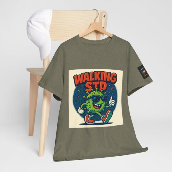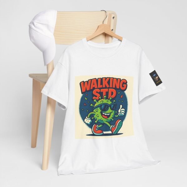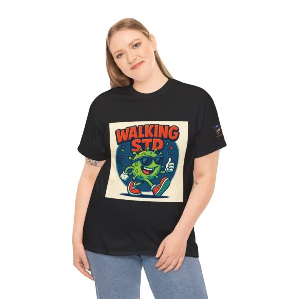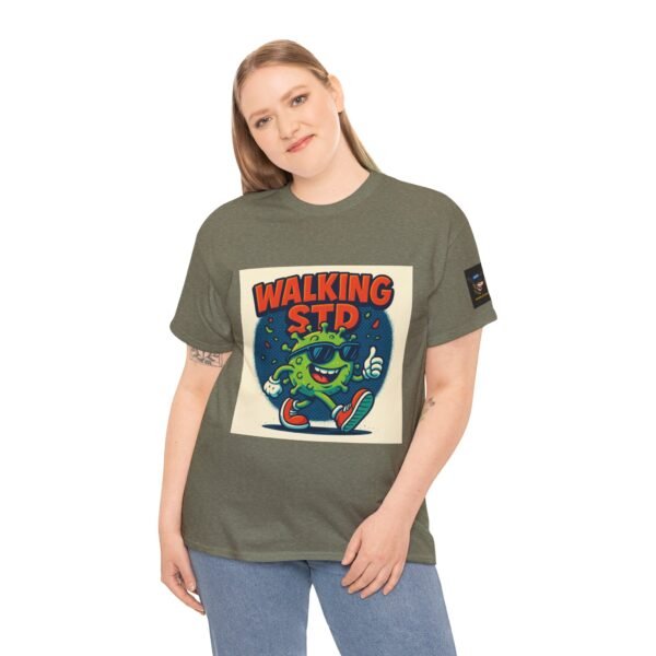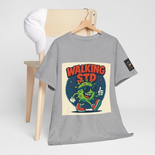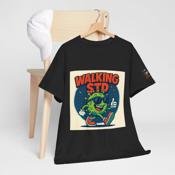 Turn heads and spark laughs with this Walking STD cartoon graphic tee. Featuring a cool virus character rocking shades and sneakers, this bold and cheeky design is perfect for fans of edgy adult humor. Great for parties, festivals, or as a gag gift for friends who appreciate over-the-top comedy.